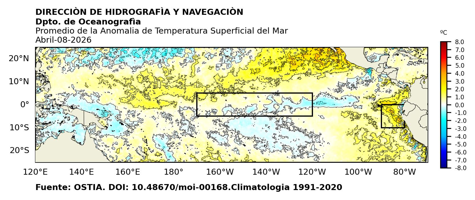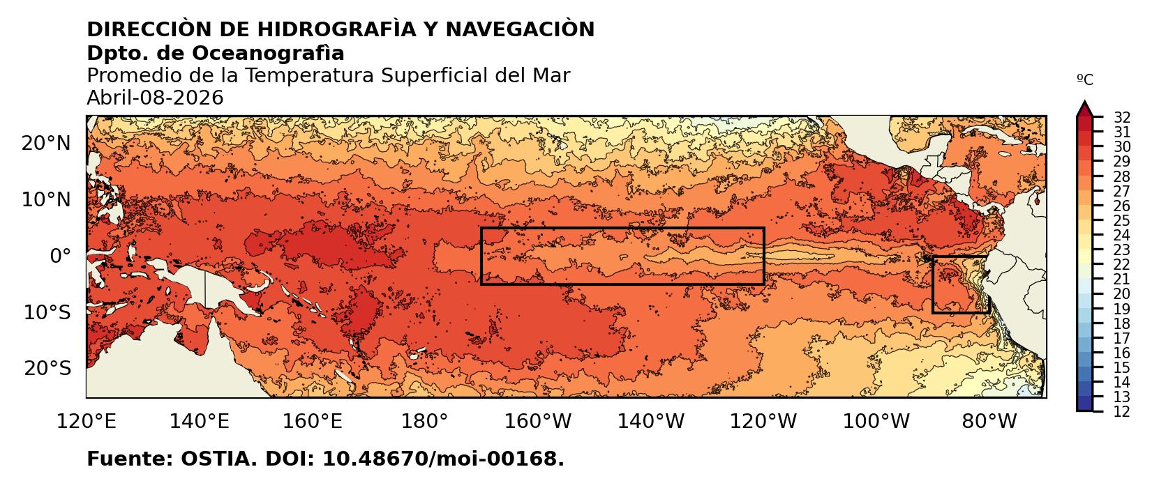 Figura 1. Temperatura superficial del mar (°C) en el océano Pacífico. Los cuadros en azul son regiones Niño. Fuente: Datos: OSTIA; Gráficos: DHN