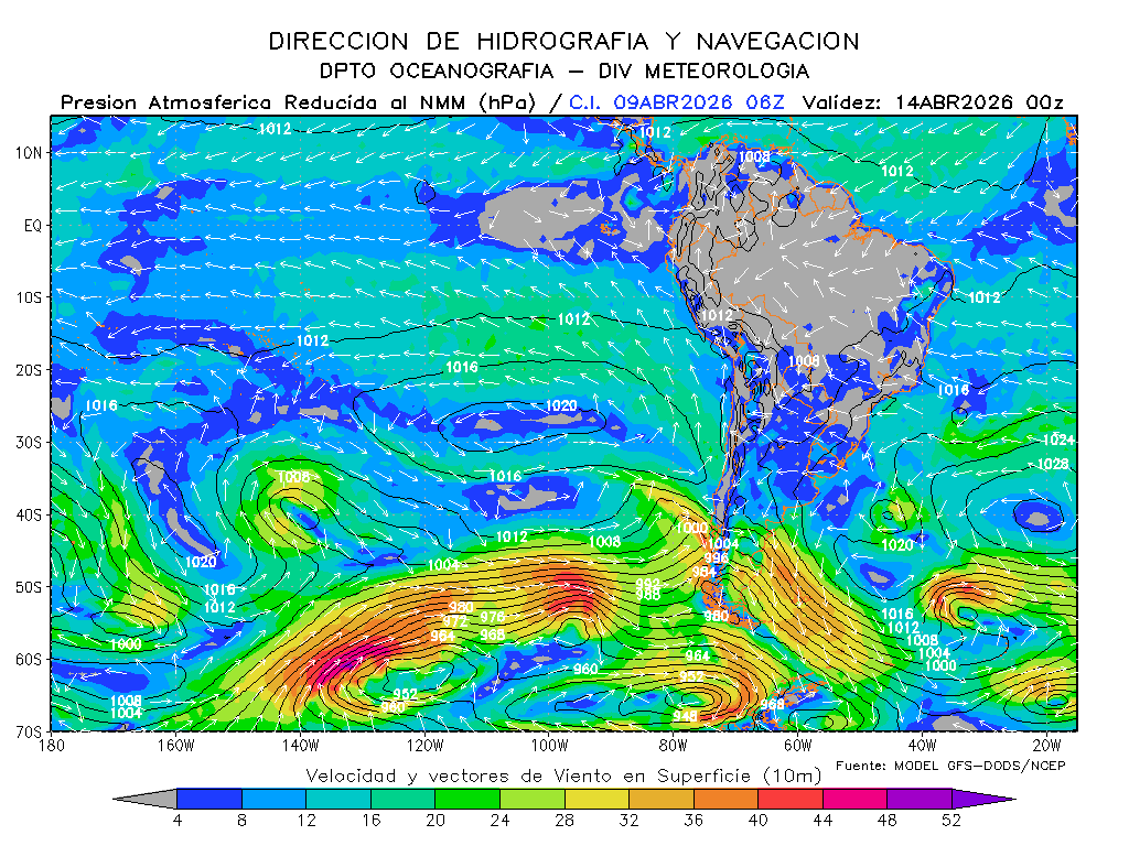 Para el 10 de abril el sistema de alta presión disminuiría dentro del rango normal con presiones máximas de 1020 hPa y ubicándose al oeste de su posición normal; debido a esto, los vientos del sudeste se presentarían con intensidad de por debajo de lo normal frente a toda la costa de Perú.