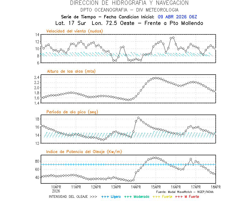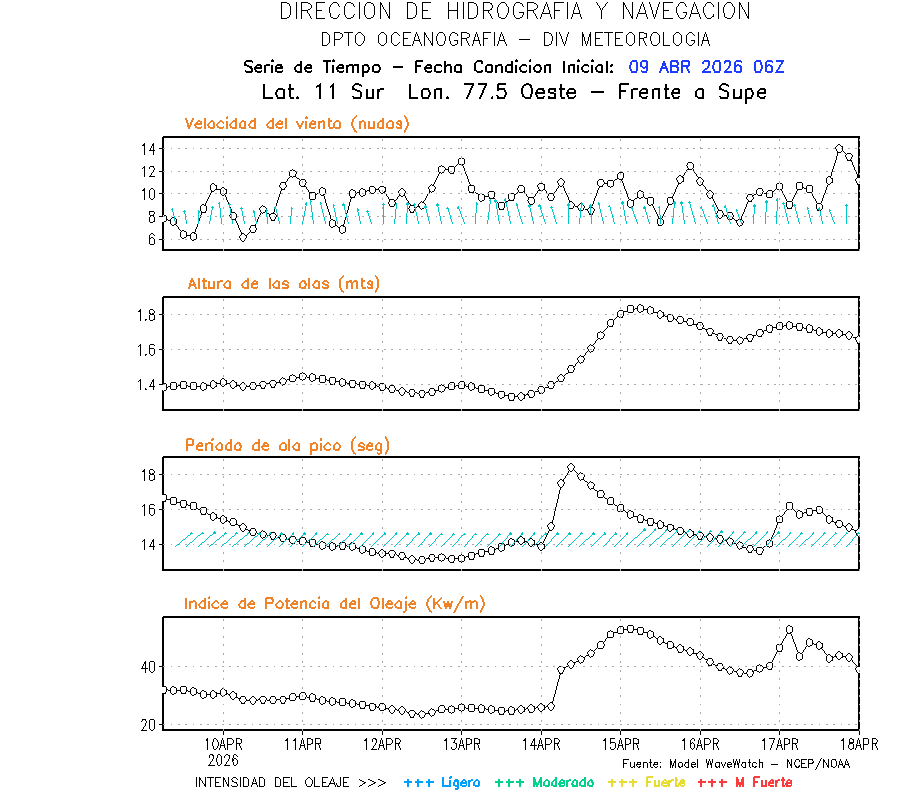 El modelo WWATCH III para el 10 de abril muestra frente a la costa norte de Perú vientos con magnitudes de 04 a 16 nudos frente a la costa norte, en el centro de 03 a 09 nudos y frente a la costa sur fluctuación de 04 a 06 nudos. El mismo modelo, muestra frente a la costa norte y centro de Perú una tendencia al incremento de la altura de las olas de 0.9 m a 1.2 m; mientras que, frente a la costa sur sería de 1.3 m a 1.6 m, asociado a periodos de 12 s a 16 s.