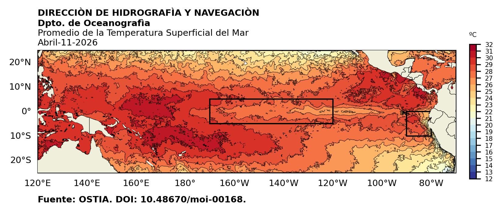 Figura 1. Temperatura superficial del mar (°C) en el océano Pacífico. Los cuadros en azul son regiones Niño. Fuente: Datos: OSTIA; Gráficos: DHN