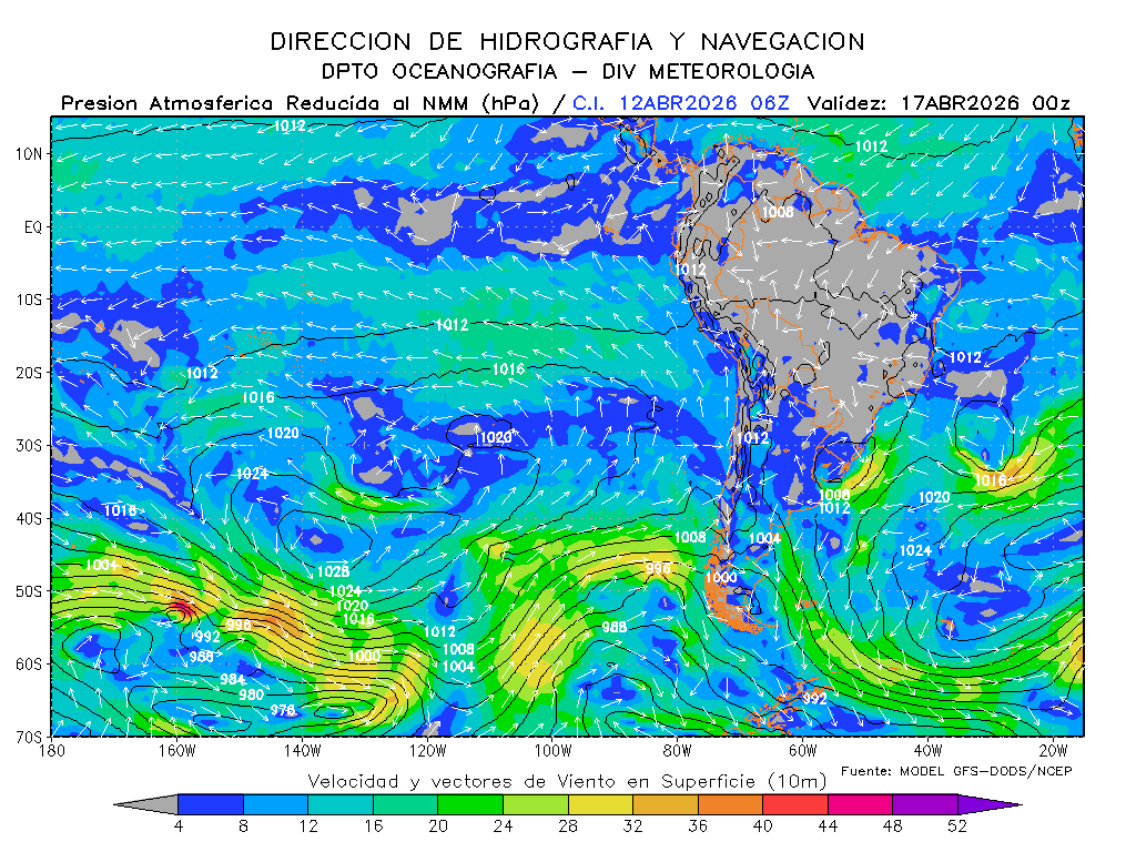 El modelo GFS-DODS/NCEP muestra que los vientos del sureste disminuirían la intensidad de su magnitud frente a la costa sur para los próximos días, se mantendrían frente a la costa norte e incrementaría frente a la centro, presentándose por debajo de lo normal frente a la costa centro de Perú y por debajo de lo normal frente a la norte y sur. El anticiclón del Pacífico sur tendría una composición zonal con un desarrollo con dirección noreste y manteniendo su intensidad, esperándose dentro de su normal y en posición ligeramente al oeste de su normal.