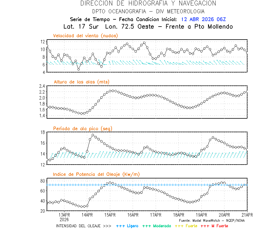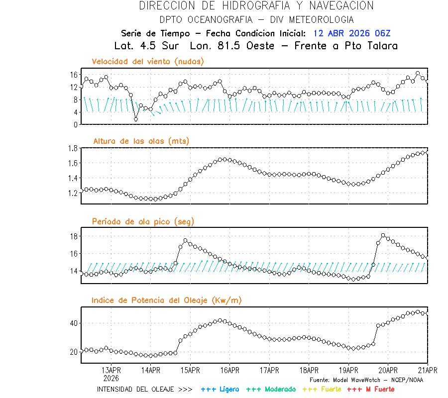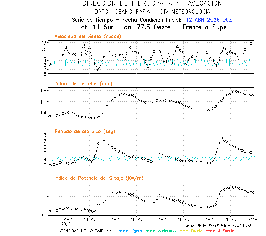 El modelo WWATCH III para el 13 de abril muestra frente a la costa norte de Perú vientos con magnitudes de 04 a 16 nudos frente a la costa norte, en el centro de 03 a 09 nudos y frente a la costa sur fluctuación de 04 a 06 nudos. El mismo modelo, muestra frente a la costa norte y centro de Perú una tendencia al incremento de la altura de las olas de 0.9 m a 1.2 m; mientras que, frente a la costa sur sería de 1.3 m a 1.6 m, asociado a periodos de 12 s a 16 s.