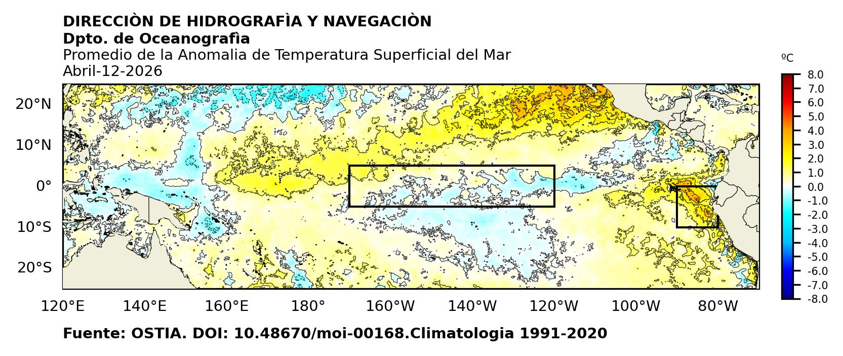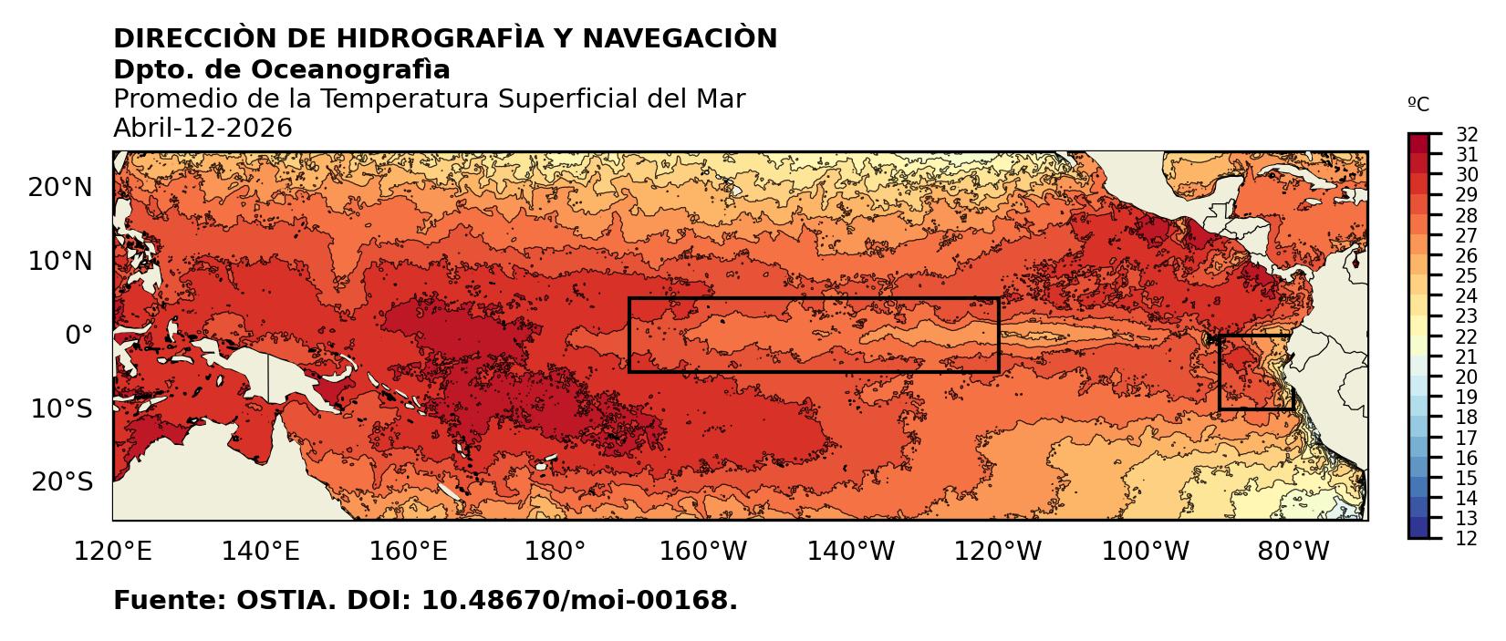 Figura 1. Temperatura superficial del mar (°C) en el océano Pacífico. Los cuadros en azul son regiones Niño. Fuente: Datos: OSTIA; Gráficos: DHN