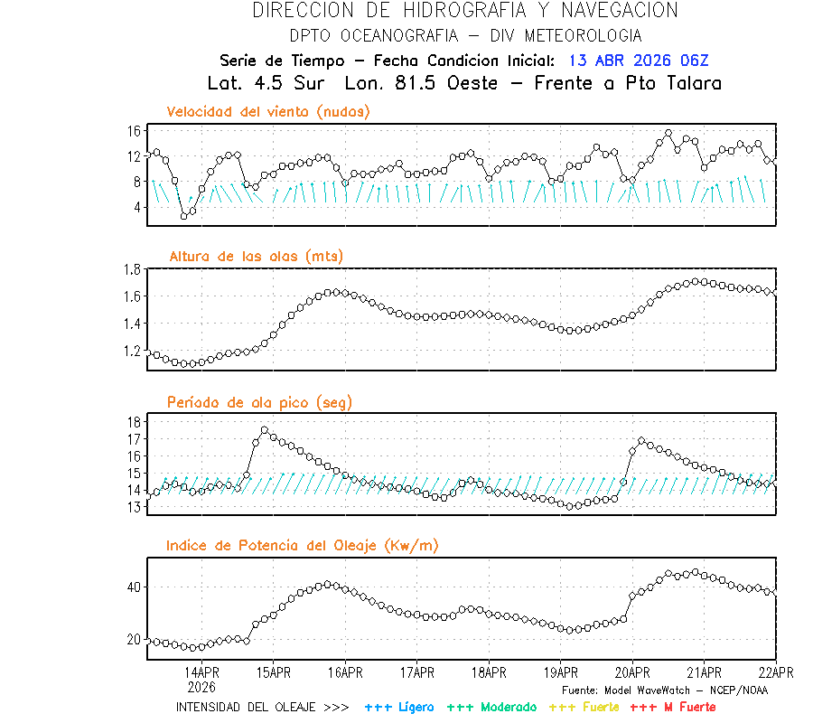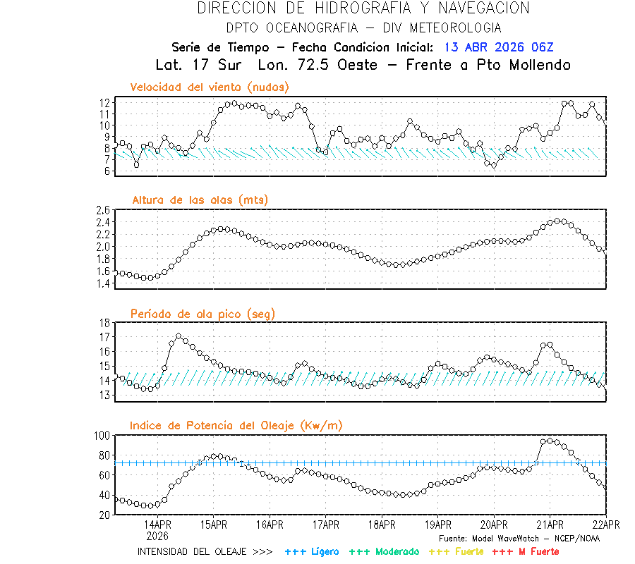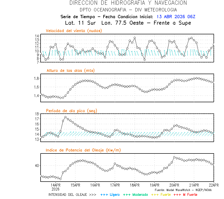 El modelo WWATCH III para el 14 de abril muestra frente a la costa norte de Perú vientos con magnitudes de 04 a 16 nudos frente a la costa norte, en el centro de 03 a 09 nudos y frente a la costa sur fluctuación de 04 a 06 nudos. El mismo modelo, muestra frente a la costa norte y centro de Perú una tendencia al incremento de la altura de las olas de 0.9 m a 1.2 m; mientras que, frente a la costa sur sería de 1.3 m a 1.6 m, asociado a periodos de 12 s a 16 s.