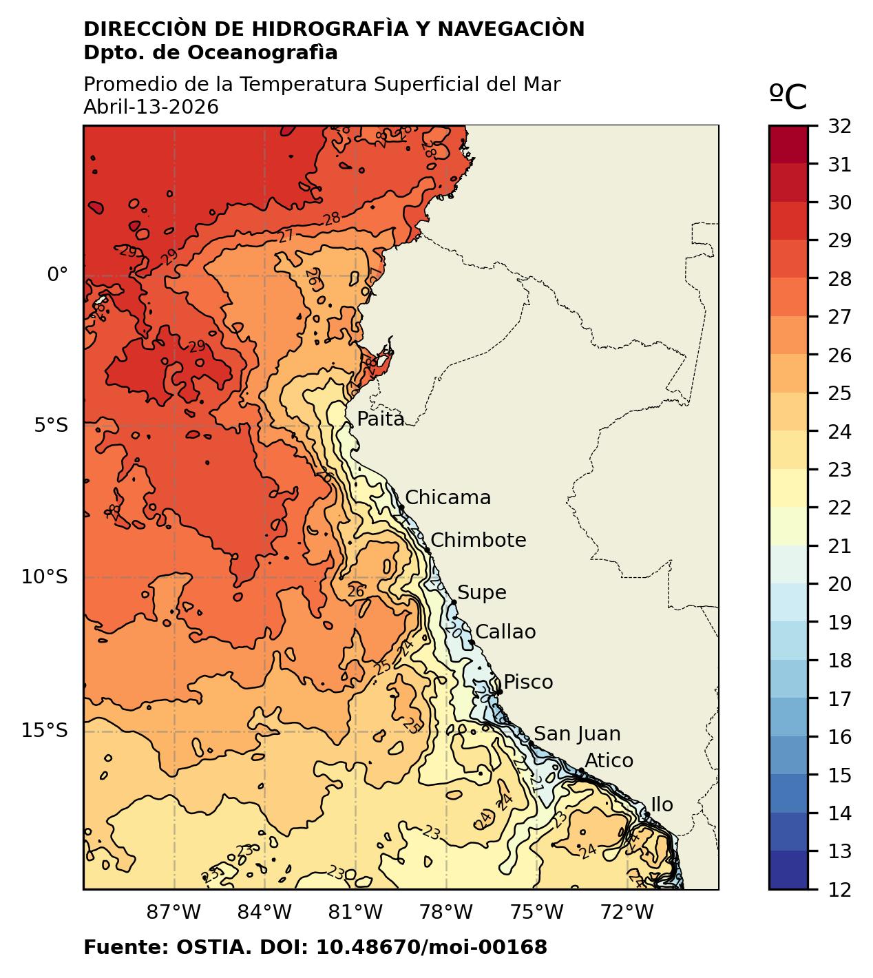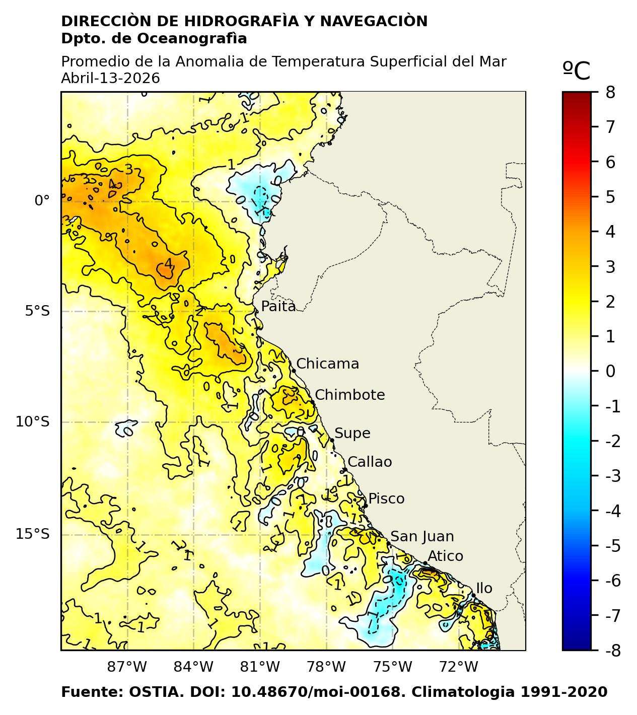 En el mar de Perú, se presentaron valores entre 26 °C y 17 °C, desarrollando condición fría frente a la costa centro y sur, con núcleos de -1 °C al sur de los 09° S dentro de las 50 millas; mientras que, frente a la costa norte condición cálida con núcleos de +1 °C y alcance alrededor de 200 millas. Sin embargo, frente a la costa sur se presentan algunos núcleos de +2 °C, principalmente de forma oceánica.