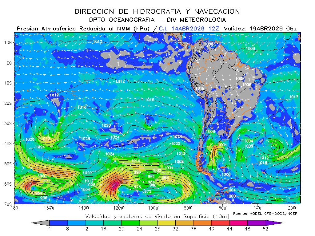 El modelo GFS-DODS/NCEP muestra que los vientos del sureste disminuirían la intensidad de su magnitud frente a la costa sur para los próximos días, se mantendrían frente a la costa norte e incrementaría frente a la centro, presentándose por debajo de lo normal frente a la costa centro de Perú y por debajo de lo normal frente a la norte y sur. El anticiclón del Pacífico sur tendría una composición zonal con un desarrollo con dirección noreste y manteniendo su intensidad, esperándose dentro de su normal y en posición ligeramente al oeste de su normal.