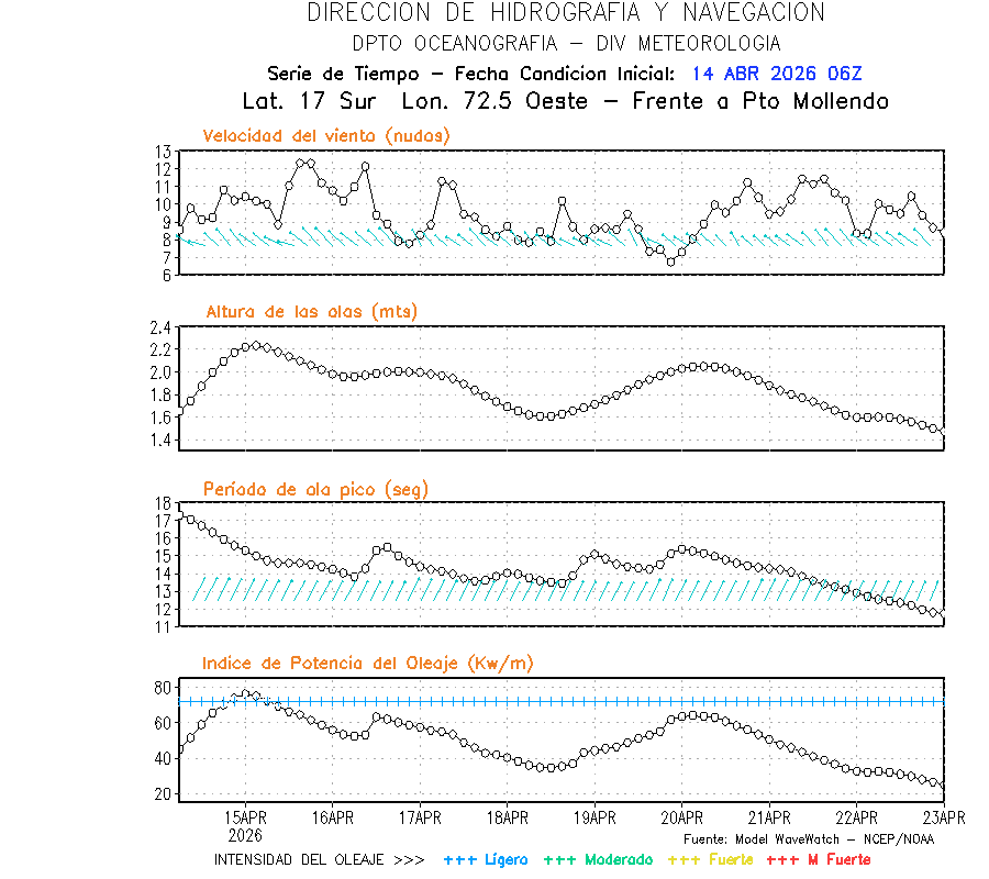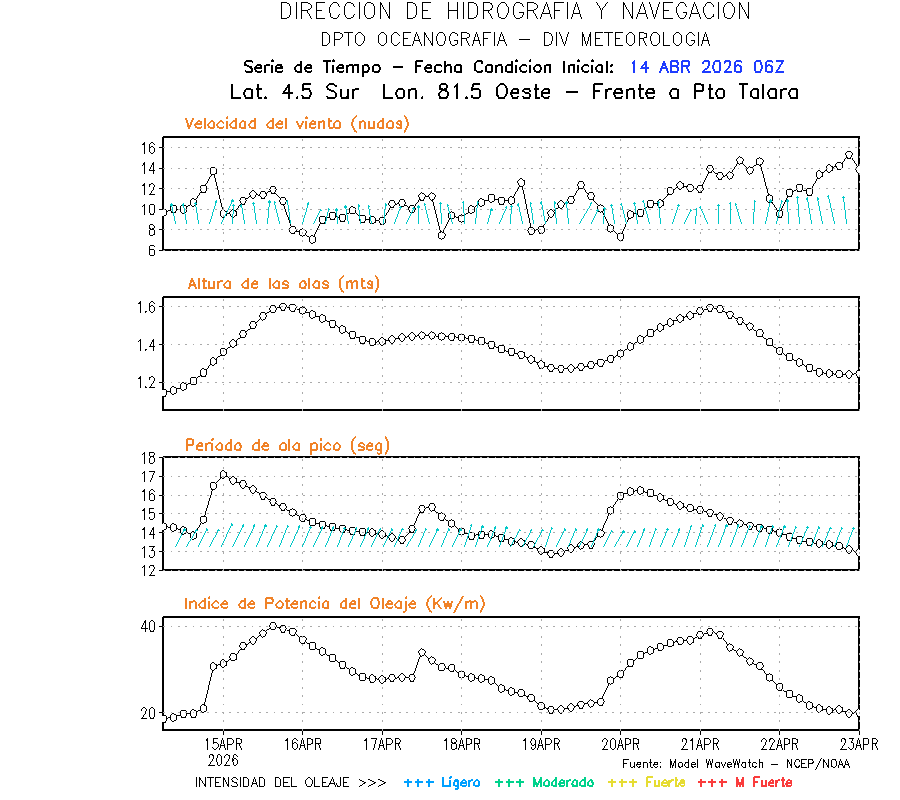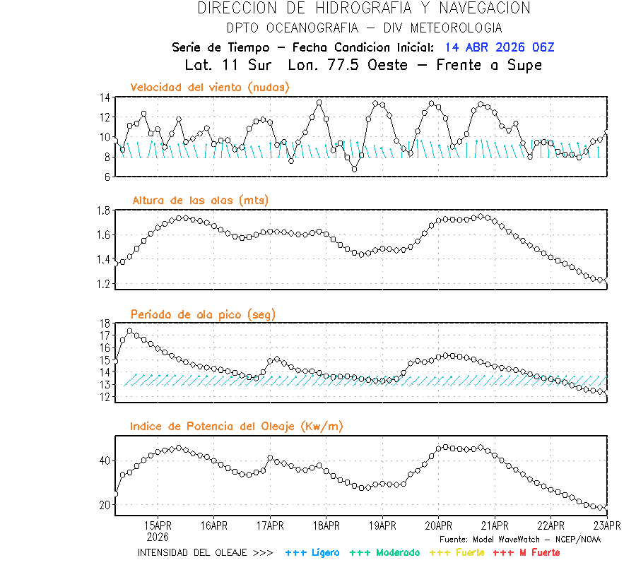 El modelo WWATCH III para el 15 de abril muestra frente a la costa norte de Perú vientos con magnitudes de 04 a 16 nudos frente a la costa norte, en el centro de 03 a 09 nudos y frente a la costa sur fluctuación de 04 a 06 nudos. El mismo modelo, muestra frente a la costa norte y centro de Perú una tendencia al incremento de la altura de las olas de 0.9 m a 1.2 m; mientras que, frente a la costa sur sería de 1.3 m a 1.6 m, asociado a periodos de 12 s a 16 s.