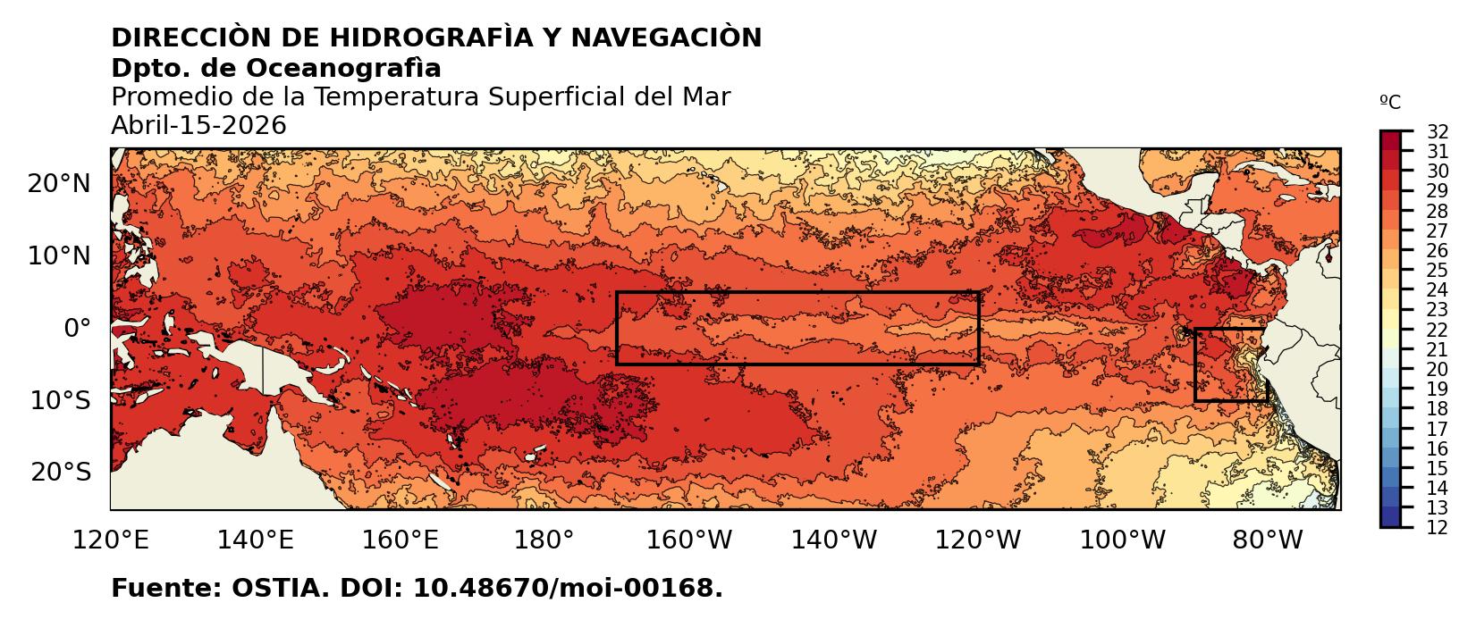 Figura 1. Temperatura superficial del mar (°C) en el océano Pacífico. Los cuadros en azul son regiones Niño. Fuente: Datos: OSTIA; Gráficos: DHN