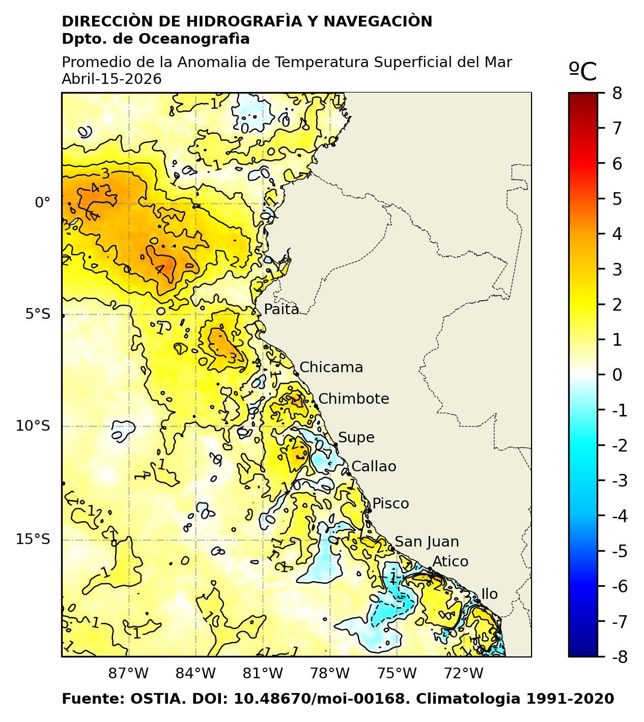 En el mar de Perú, se presentaron valores entre 26 °C y 17 °C, desarrollando condición fría frente a la costa centro y sur, con núcleos de -1 °C al sur de los 09° S dentro de las 50 millas; mientras que, frente a la costa norte condición cálida con núcleos de +1 °C y alcance alrededor de 200 millas. Sin embargo, frente a la costa sur se presentan algunos núcleos de +2 °C, principalmente de forma oceánica.