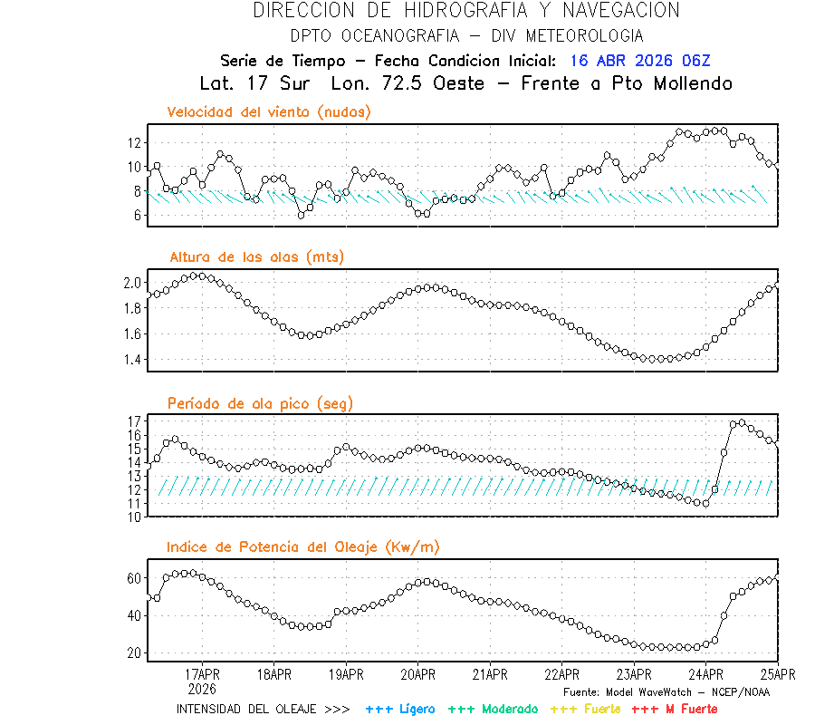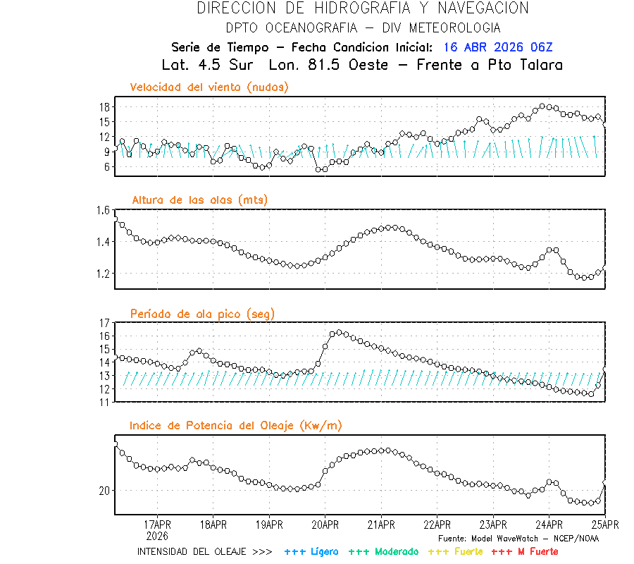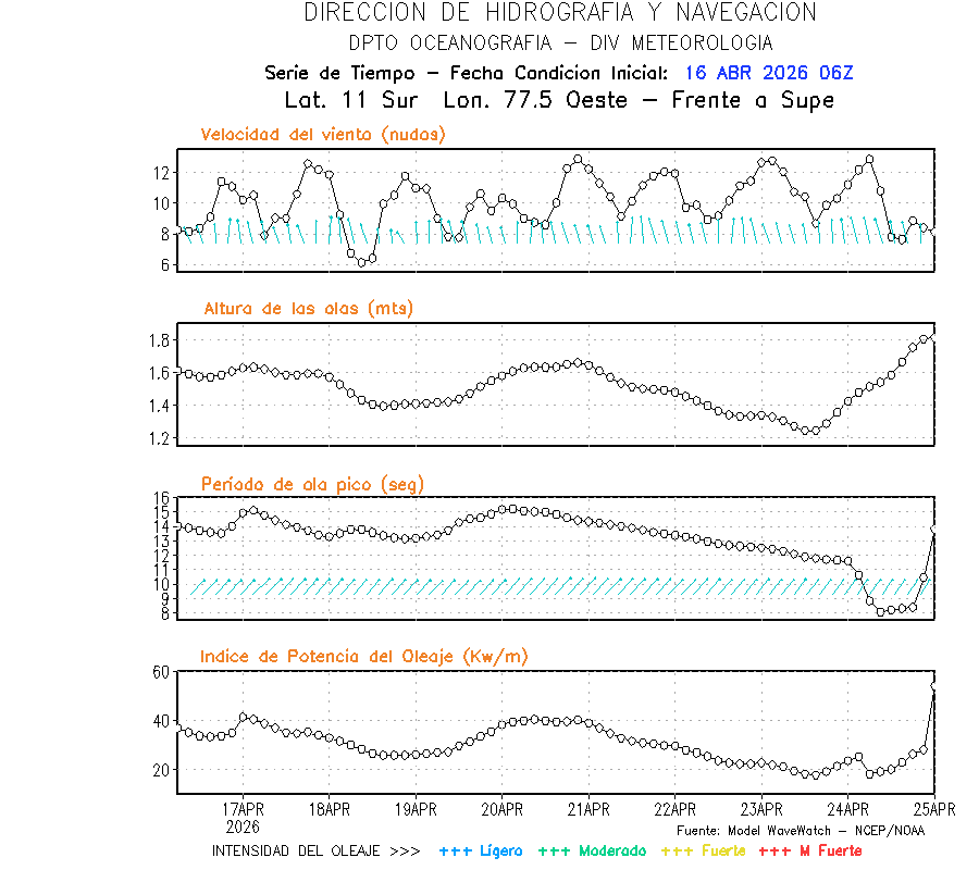 El modelo WWATCH III para el 17 de abril muestra frente a la costa norte de Perú vientos con magnitudes de 04 a 16 nudos frente a la costa norte, en el centro de 03 a 09 nudos y frente a la costa sur fluctuación de 04 a 06 nudos. El mismo modelo, muestra frente a la costa norte y centro de Perú una tendencia al incremento de la altura de las olas de 0.9 m a 1.2 m; mientras que, frente a la costa sur sería de 1.3 m a 1.6 m, asociado a periodos de 12 s a 16 s.