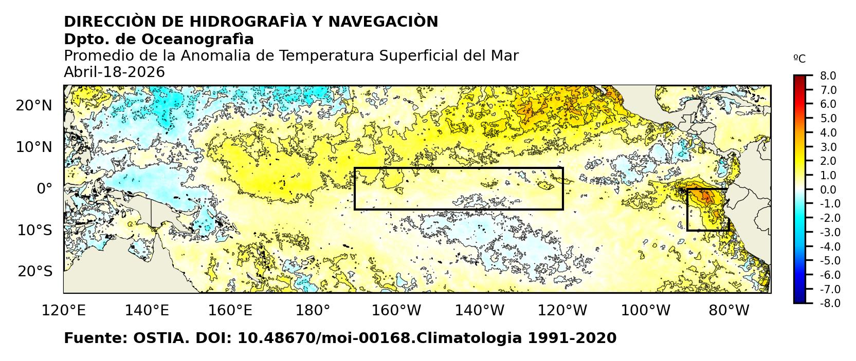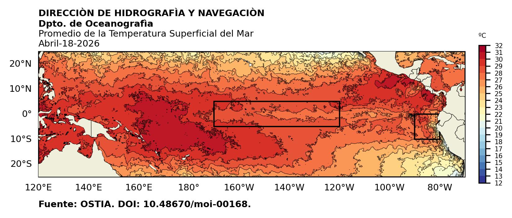 Figura 1. Temperatura superficial del mar (°C) en el océano Pacífico. Los cuadros en azul son regiones Niño. Fuente: Datos: OSTIA; Gráficos: DHN