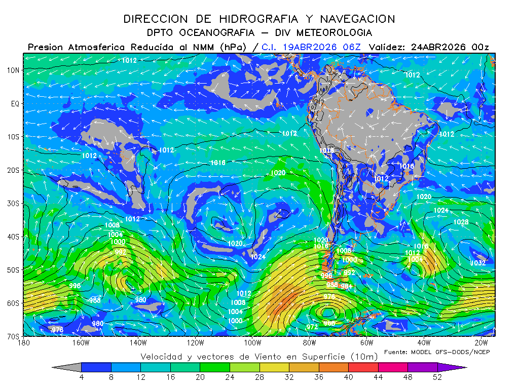 El modelo GFS-DODS/NCEP muestra que los vientos del sureste disminuirían la intensidad de su magnitud frente a la costa sur para los próximos días, se mantendrían frente a la costa norte e incrementaría frente a la centro, presentándose por debajo de lo normal frente a la costa centro de Perú y por debajo de lo normal frente a la norte y sur. El anticiclón del Pacífico sur tendría una composición zonal con un desarrollo con dirección noreste y manteniendo su intensidad, esperándose dentro de su normal y en posición ligeramente al oeste de su normal.