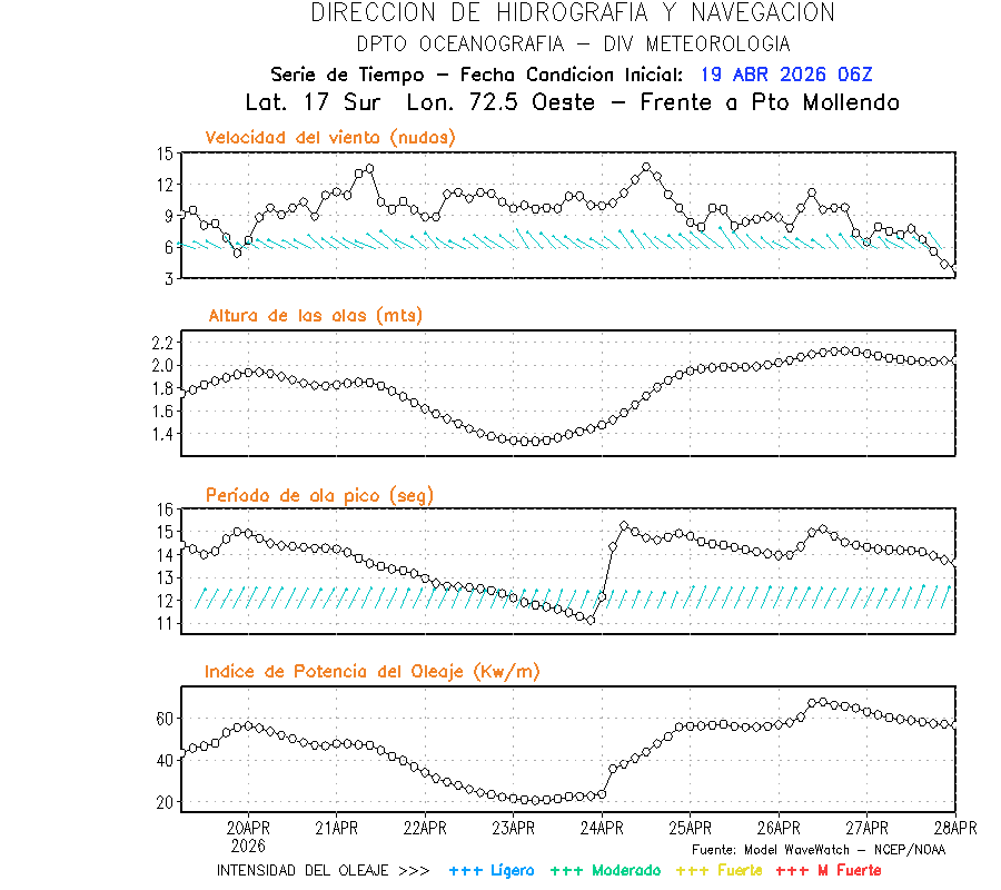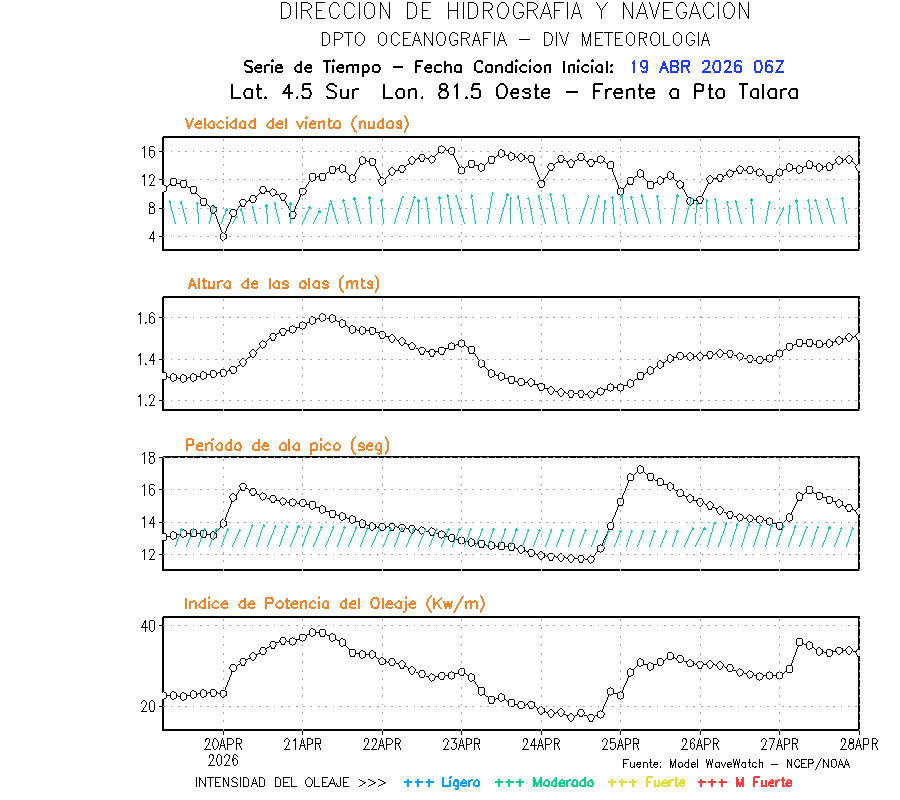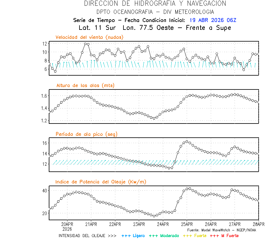 El modelo WWATCH III para el 20 de abril muestra frente a la costa norte de Perú vientos con magnitudes de 04 a 16 nudos frente a la costa norte, en el centro de 03 a 09 nudos y frente a la costa sur fluctuación de 04 a 06 nudos. El mismo modelo, muestra frente a la costa norte y centro de Perú una tendencia al incremento de la altura de las olas de 0.9 m a 1.2 m; mientras que, frente a la costa sur sería de 1.3 m a 1.6 m, asociado a periodos de 12 s a 16 s.
