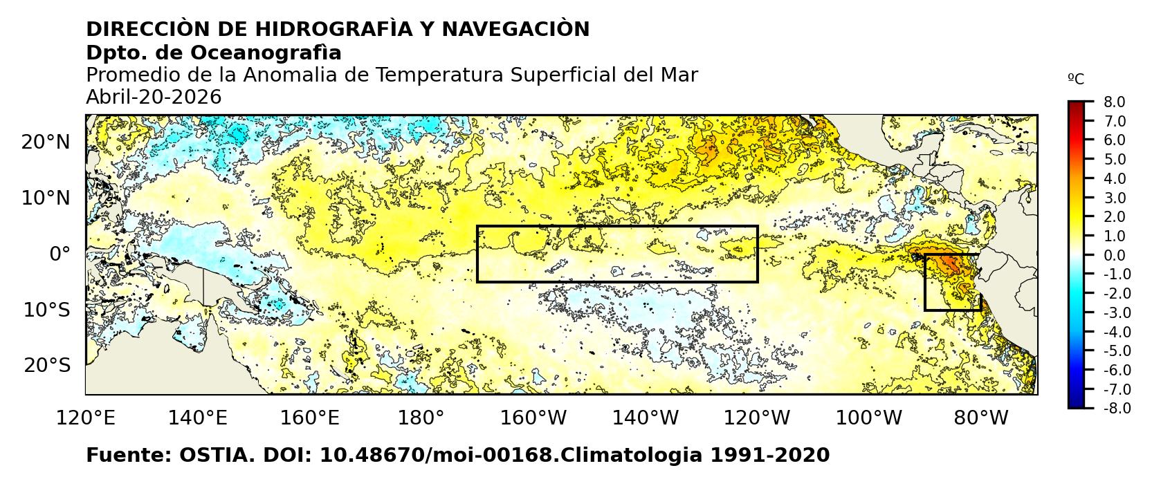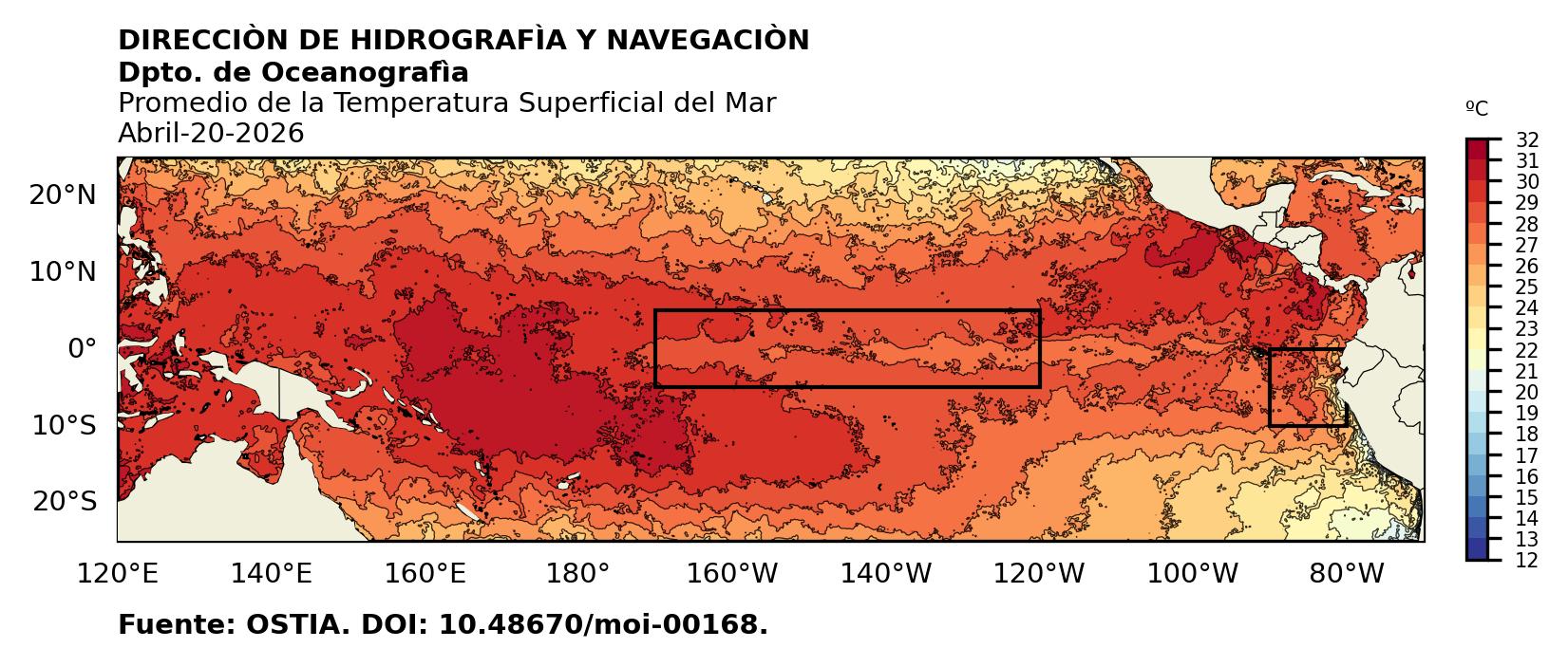 Figura 1. Temperatura superficial del mar (°C) en el océano Pacífico. Los cuadros en azul son regiones Niño. Fuente: Datos: OSTIA; Gráficos: DHN