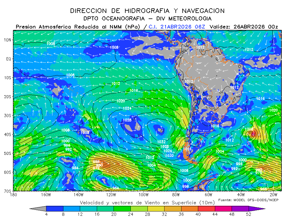 El modelo GFS-DODS/NCEP muestra que los vientos del sureste disminuirían la intensidad de su magnitud frente a la costa sur para los próximos días, se mantendrían frente a la costa norte e incrementaría frente a la centro, presentándose por debajo de lo normal frente a la costa centro de Perú y por debajo de lo normal frente a la norte y sur. El anticiclón del Pacífico sur tendría una composición zonal con un desarrollo con dirección noreste y manteniendo su intensidad, esperándose dentro de su normal y en posición ligeramente al oeste de su normal.