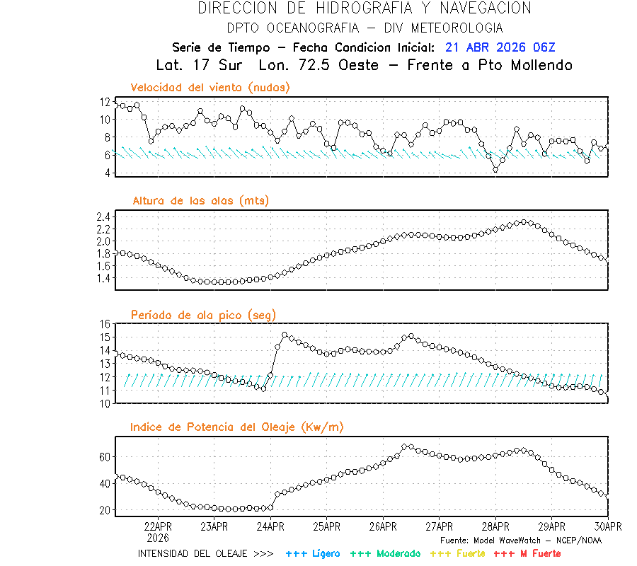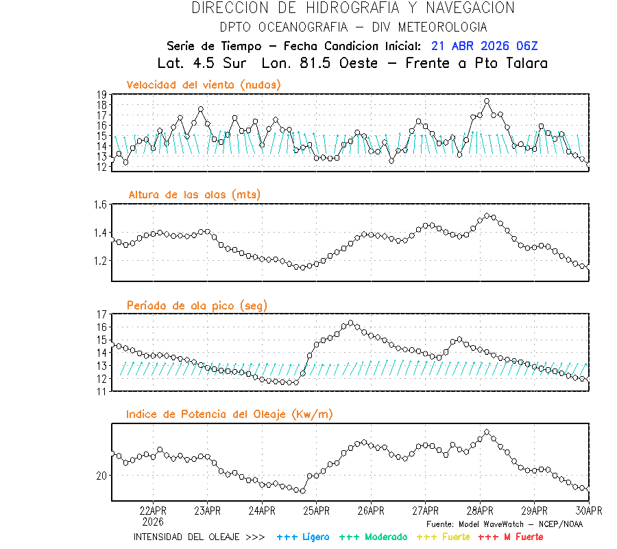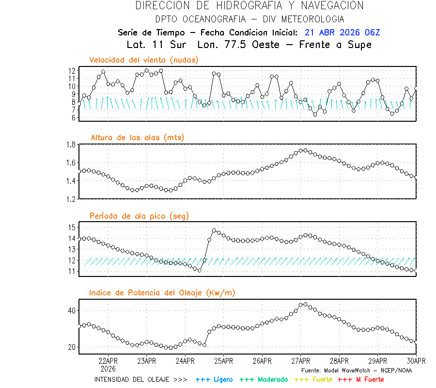 El modelo WWATCH III para el 22 de abril muestra frente a la costa norte de Perú vientos con magnitudes de 04 a 16 nudos frente a la costa norte, en el centro de 03 a 09 nudos y frente a la costa sur fluctuación de 04 a 06 nudos. El mismo modelo, muestra frente a la costa norte y centro de Perú una tendencia al incremento de la altura de las olas de 0.9 m a 1.2 m; mientras que, frente a la costa sur sería de 1.3 m a 1.6 m, asociado a periodos de 12 s a 16 s.
