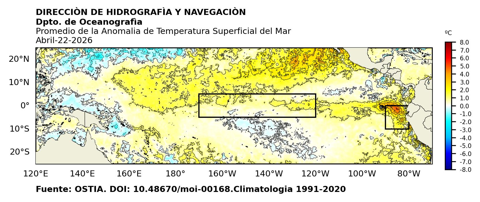 Figura 1. Temperatura superficial del mar (°C) en el océano Pacífico. Los cuadros en azul son regiones Niño. Fuente: Datos: OSTIA; Gráficos: DHN