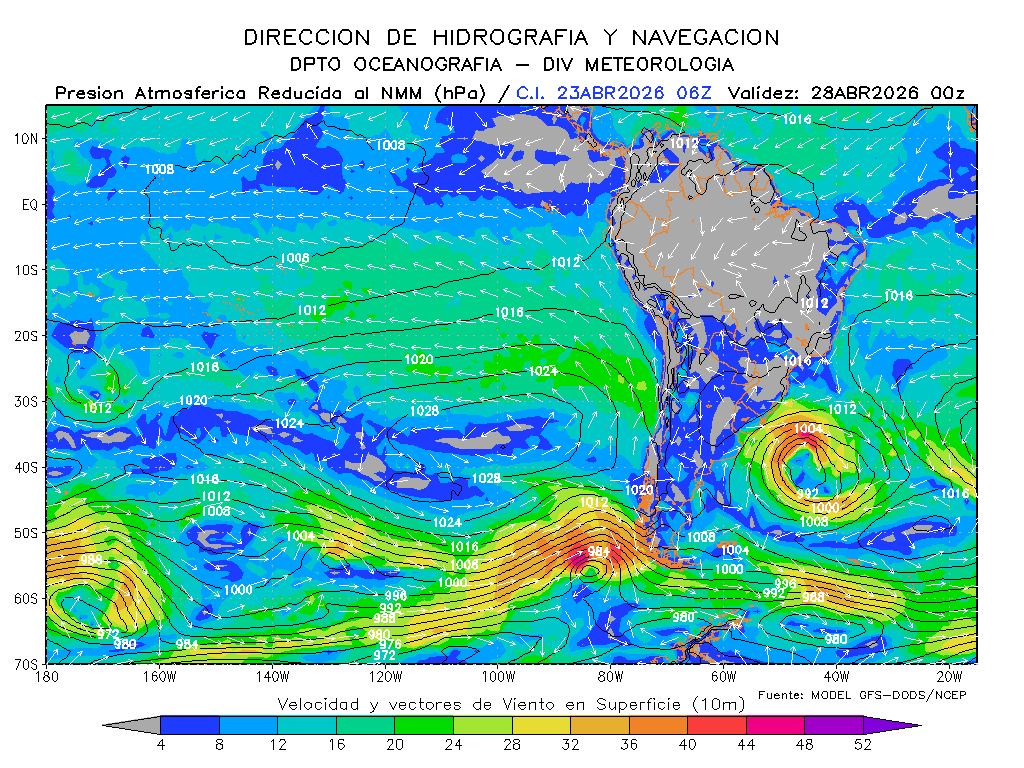 El modelo GFS-DODS/NCEP muestra que los vientos del sureste disminuirían la intensidad de su magnitud frente a la costa sur para los próximos días, se mantendrían frente a la costa norte e incrementaría frente a la centro, presentándose por debajo de lo normal frente a la costa centro de Perú y por debajo de lo normal frente a la norte y sur. El anticiclón del Pacífico sur tendría una composición zonal con un desarrollo con dirección noreste y manteniendo su intensidad, esperándose dentro de su normal y en posición ligeramente al oeste de su normal.