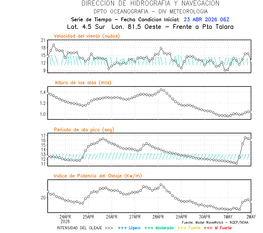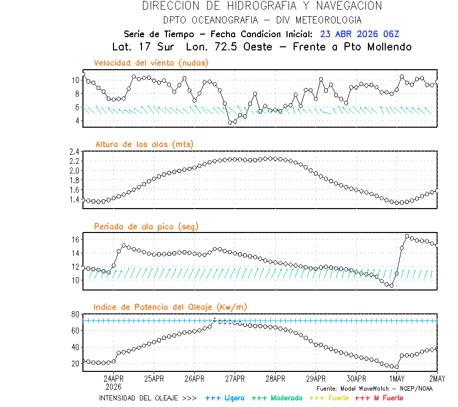 El modelo WWATCH III para el 24 de abril muestra frente a la costa norte de Perú vientos con magnitudes de 04 a 16 nudos frente a la costa norte, en el centro de 03 a 09 nudos y frente a la costa sur fluctuación de 04 a 06 nudos. El mismo modelo, muestra frente a la costa norte y centro de Perú una tendencia al incremento de la altura de las olas de 0.9 m a 1.2 m; mientras que, frente a la costa sur sería de 1.3 m a 1.6 m, asociado a periodos de 12 s a 16 s.