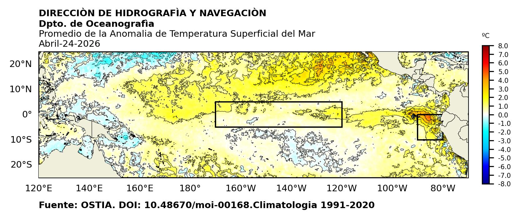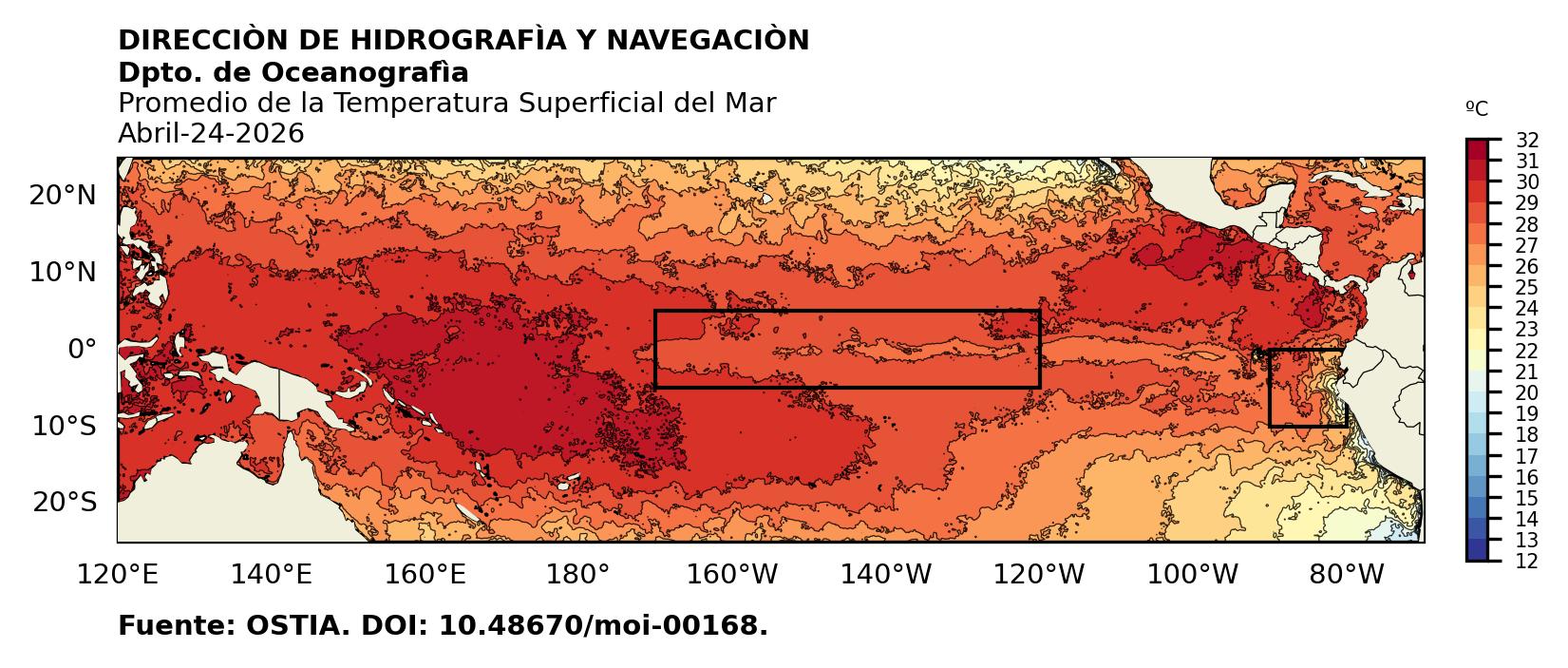 Figura 1. Temperatura superficial del mar (°C) en el océano Pacífico. Los cuadros en azul son regiones Niño. Fuente: Datos: OSTIA; Gráficos: DHN