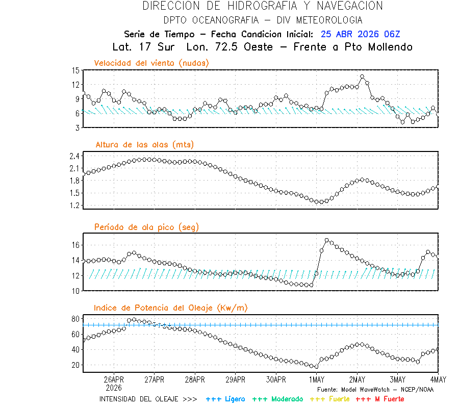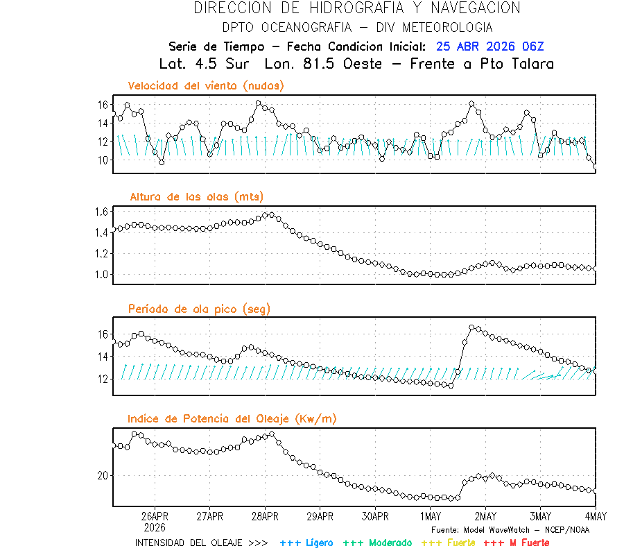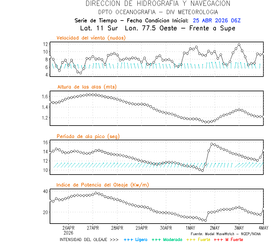 El modelo WWATCH III para el 26 de abril muestra frente a la costa norte de Perú vientos con magnitudes de 04 a 16 nudos frente a la costa norte, en el centro de 03 a 09 nudos y frente a la costa sur fluctuación de 04 a 06 nudos. El mismo modelo, muestra frente a la costa norte y centro de Perú una tendencia al incremento de la altura de las olas de 0.9 m a 1.2 m; mientras que, frente a la costa sur sería de 1.3 m a 1.6 m, asociado a periodos de 12 s a 16 s.