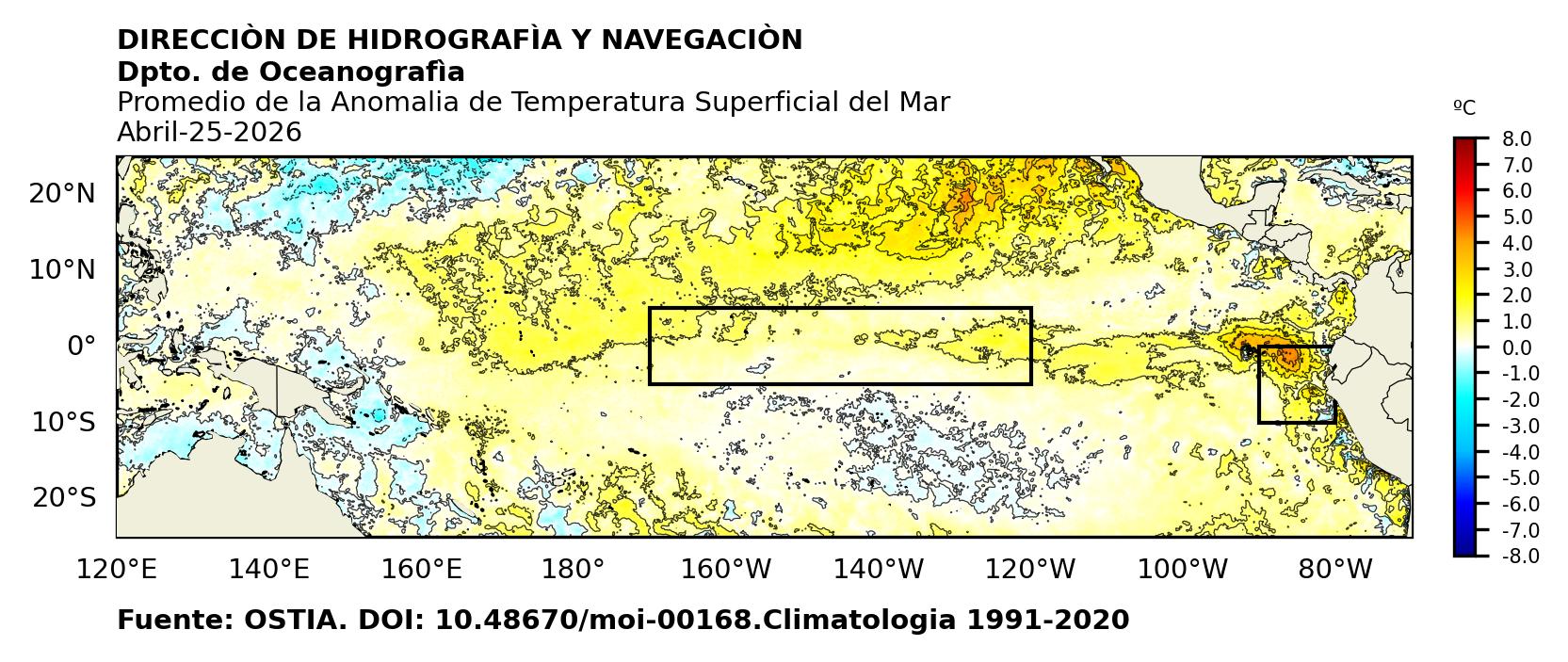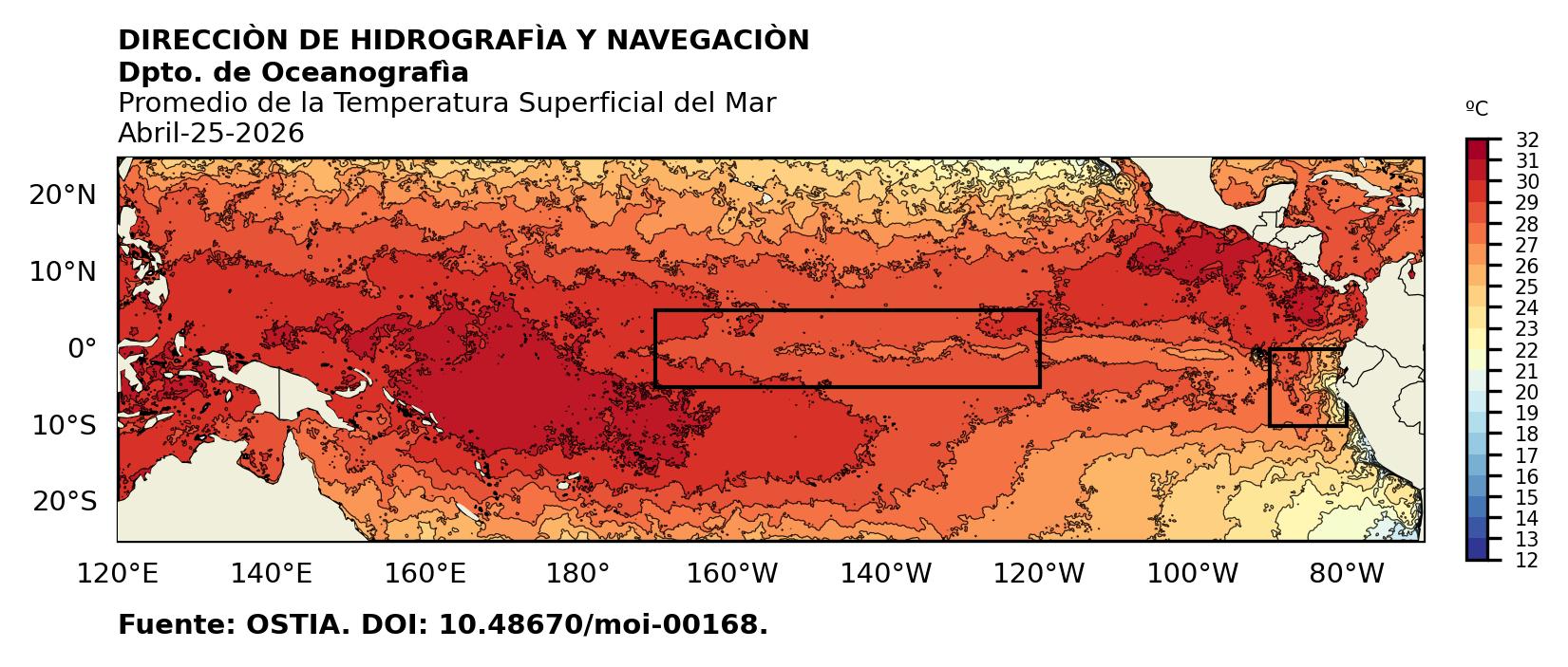 Figura 1. Temperatura superficial del mar (°C) en el océano Pacífico. Los cuadros en azul son regiones Niño. Fuente: Datos: OSTIA; Gráficos: DHN
