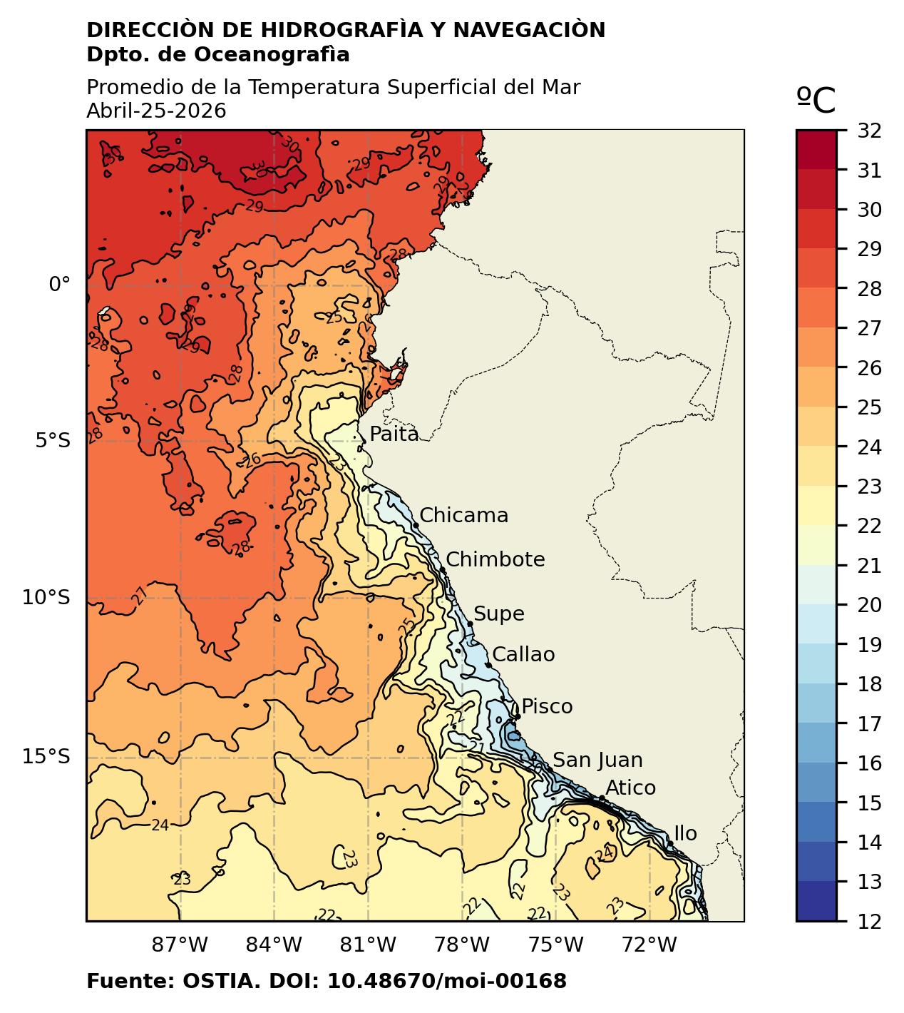 , linea azul isoterma 26°.Fuente: Datos:OSTIA; Gráficos:DHN.