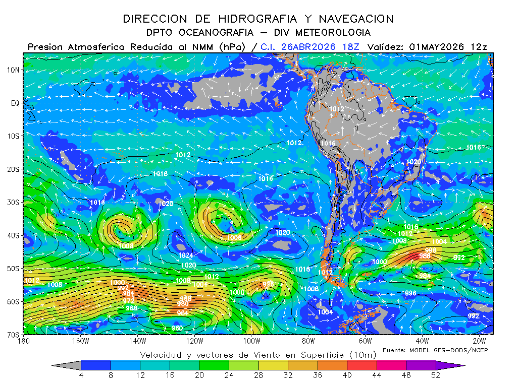 El modelo GFS-DODS/NCEP muestra que los vientos del sureste disminuirían la intensidad de su magnitud frente a la costa sur para los próximos días, se mantendrían frente a la costa norte e incrementaría frente a la centro, presentándose por debajo de lo normal frente a la costa centro de Perú y por debajo de lo normal frente a la norte y sur. El anticiclón del Pacífico sur tendría una composición zonal con un desarrollo con dirección noreste y manteniendo su intensidad, esperándose dentro de su normal y en posición ligeramente al oeste de su normal.