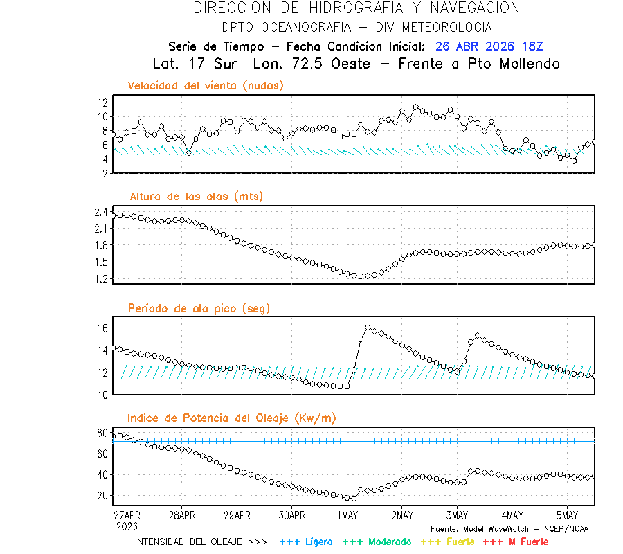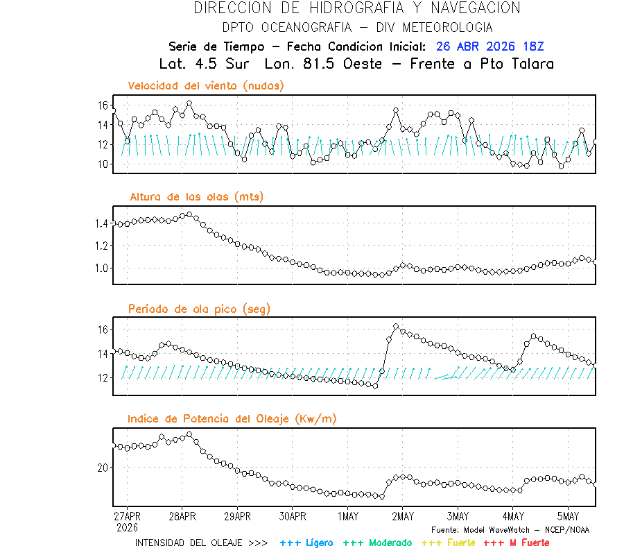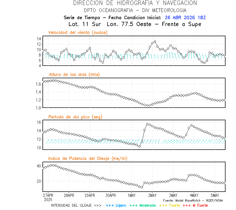 El modelo WWATCH III para el 27 de abril muestra frente a la costa norte de Perú vientos con magnitudes de 04 a 16 nudos frente a la costa norte, en el centro de 03 a 09 nudos y frente a la costa sur fluctuación de 04 a 06 nudos. El mismo modelo, muestra frente a la costa norte y centro de Perú una tendencia al incremento de la altura de las olas de 0.9 m a 1.2 m; mientras que, frente a la costa sur sería de 1.3 m a 1.6 m, asociado a periodos de 12 s a 16 s.
