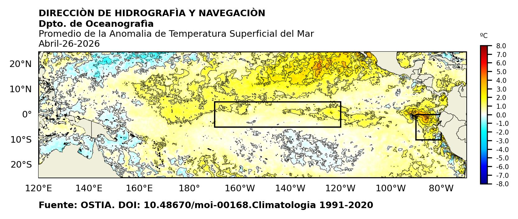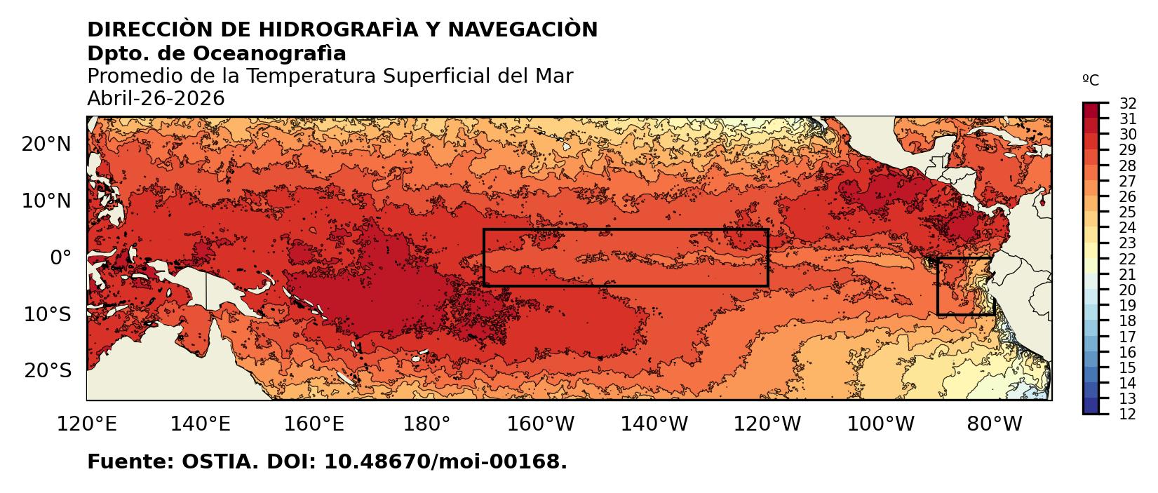 Figura 1. Temperatura superficial del mar (°C) en el océano Pacífico. Los cuadros en azul son regiones Niño. Fuente: Datos: OSTIA; Gráficos: DHN