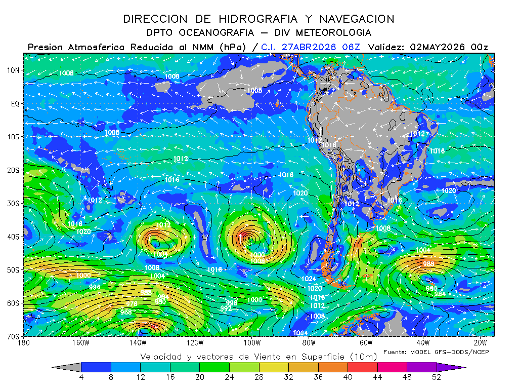El modelo GFS-DODS/NCEP muestra que los vientos del sureste disminuirían la intensidad de su magnitud frente a la costa sur para los próximos días, se mantendrían frente a la costa norte e incrementaría frente a la centro, presentándose por debajo de lo normal frente a la costa centro de Perú y por debajo de lo normal frente a la norte y sur. El anticiclón del Pacífico sur tendría una composición zonal con un desarrollo con dirección noreste y manteniendo su intensidad, esperándose dentro de su normal y en posición ligeramente al oeste de su normal.