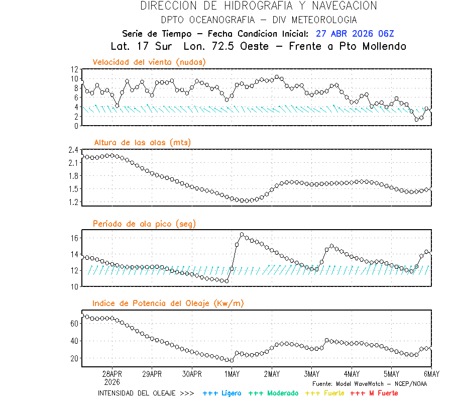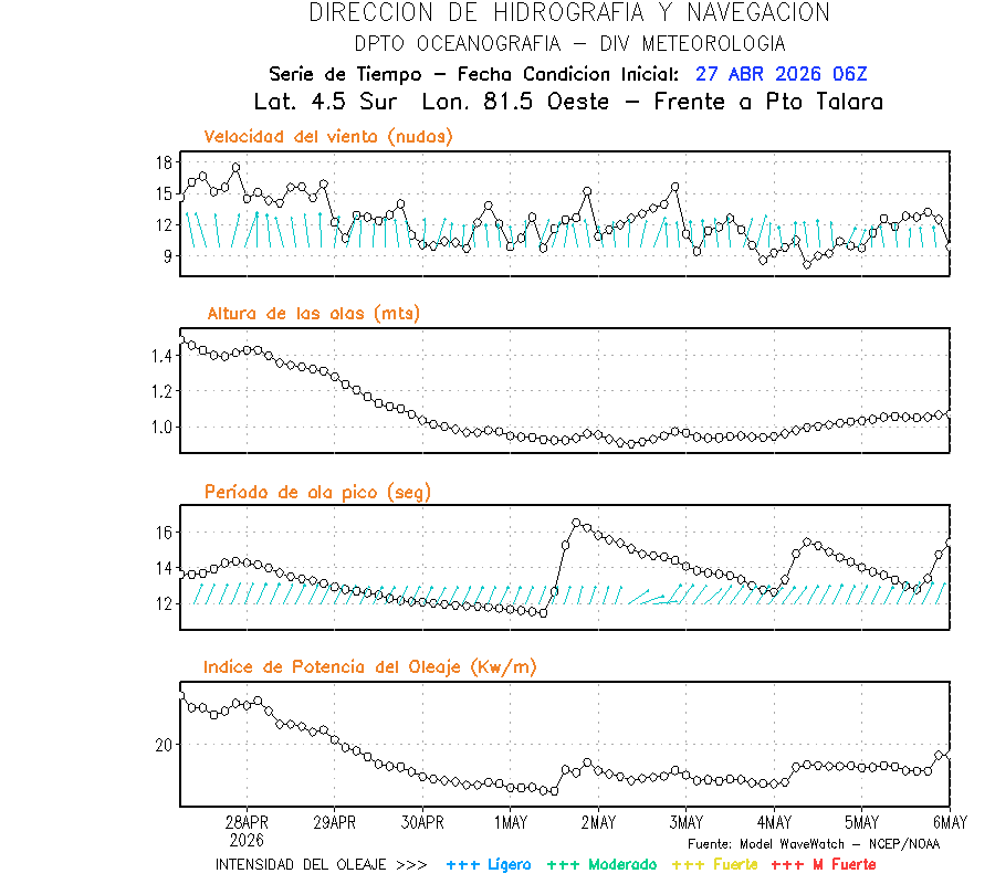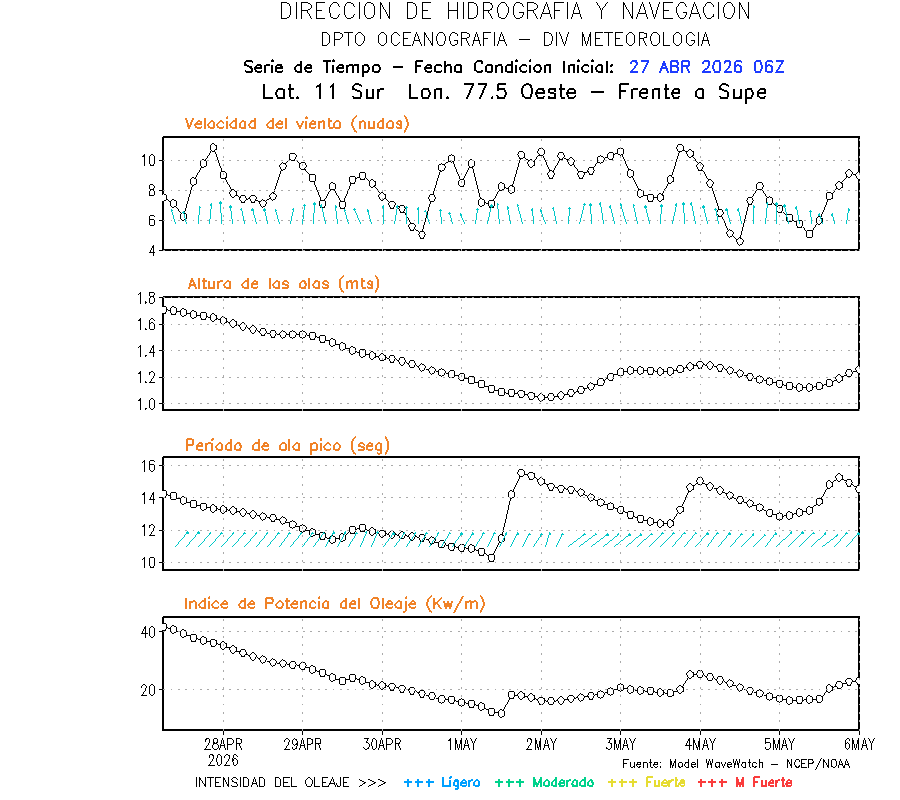 El modelo WWATCH III para el 28 de abril muestra frente a la costa norte de Perú vientos con magnitudes de 04 a 16 nudos frente a la costa norte, en el centro de 03 a 09 nudos y frente a la costa sur fluctuación de 04 a 06 nudos. El mismo modelo, muestra frente a la costa norte y centro de Perú una tendencia al incremento de la altura de las olas de 0.9 m a 1.2 m; mientras que, frente a la costa sur sería de 1.3 m a 1.6 m, asociado a periodos de 12 s a 16 s.