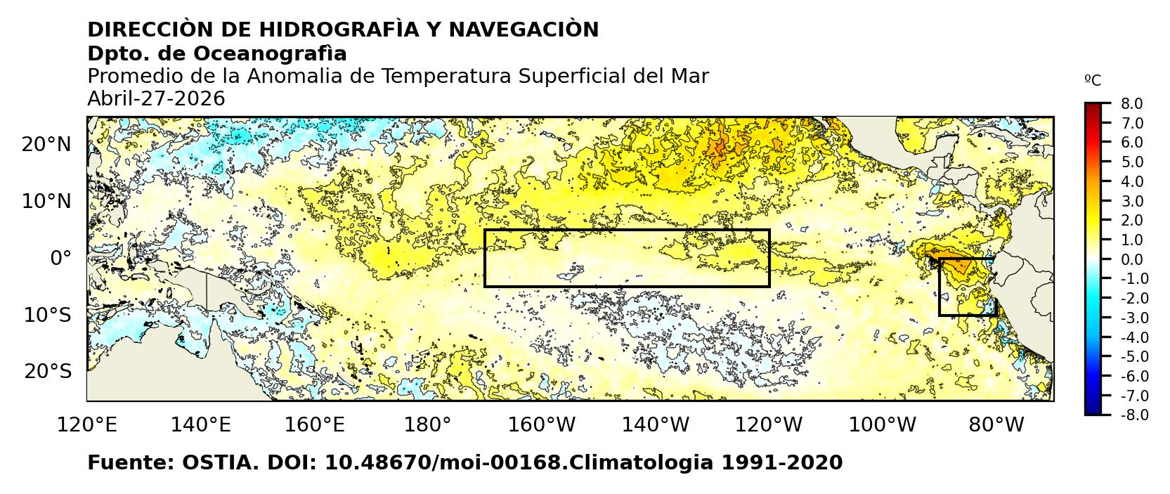 Figura 1. Temperatura superficial del mar (°C) en el océano Pacífico. Los cuadros en azul son regiones Niño. Fuente: Datos: OSTIA; Gráficos: DHN