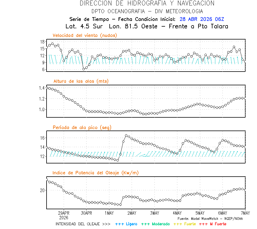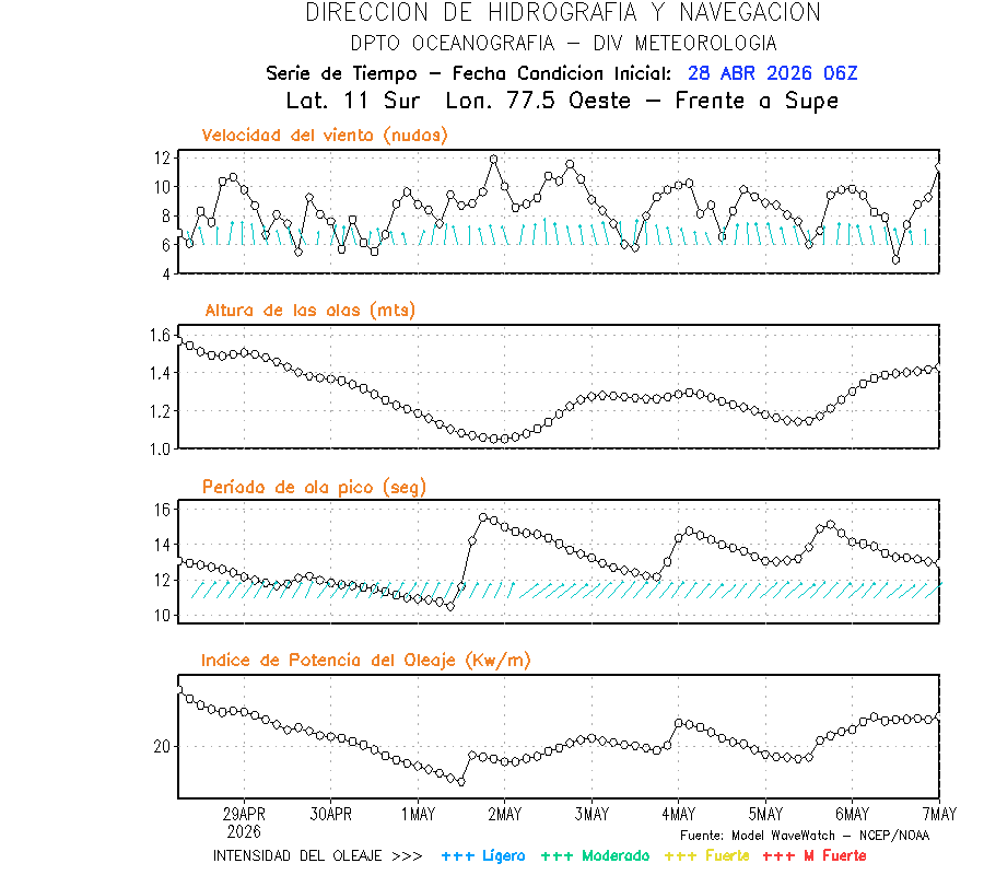 El modelo WWATCH III para el 29 de abril muestra frente a la costa norte de Perú vientos con magnitudes de 04 a 16 nudos frente a la costa norte, en el centro de 03 a 09 nudos y frente a la costa sur fluctuación de 04 a 06 nudos. El mismo modelo, muestra frente a la costa norte y centro de Perú una tendencia al incremento de la altura de las olas de 0.9 m a 1.2 m; mientras que, frente a la costa sur sería de 1.3 m a 1.6 m, asociado a periodos de 12 s a 16 s.