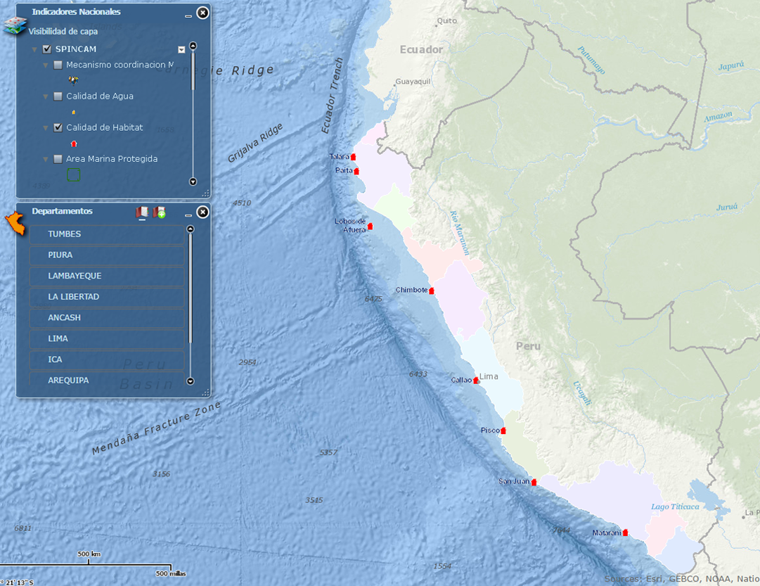El atlas del proyecto SPINCAM-Perú, se ha desarrollado a través de una interface web amigable, donde se muestra la representación gráfica de los indicadores costeros desarrollados a escala nacional.